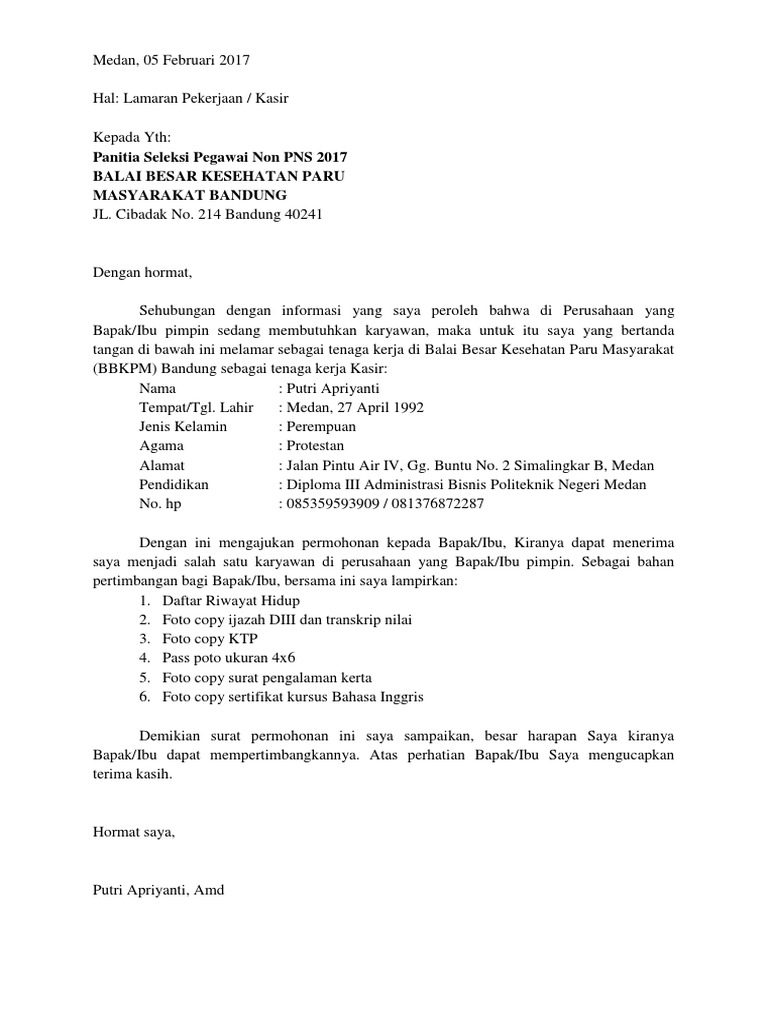 Contoh Surat Lamaran Kerja Menjadi Kasir Dan Contoh Daftar Riwayat Hidup