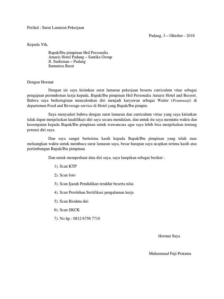 Surat Lamaran Kerja Di Hotel