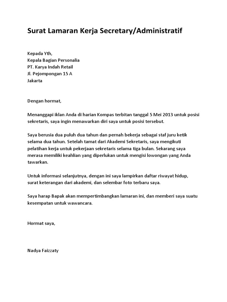 Surat Lamaran Kerja Sekretaris | Surat, Bahasa, Riwayat hidup