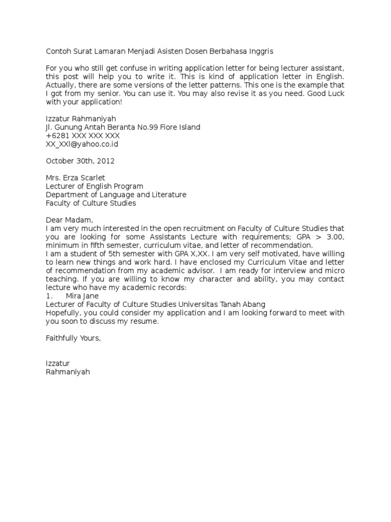 Contoh Surat Lamaran Menjadi Asisten Dosen Berbahasa Inggris | Sales | Business
