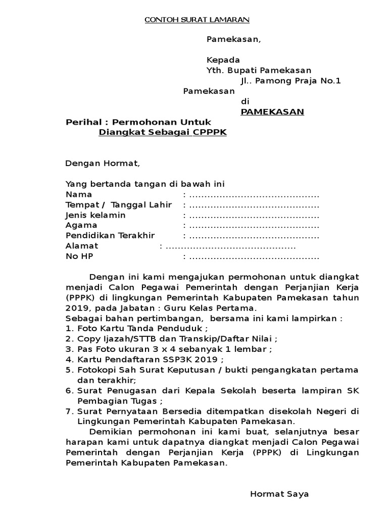 Contoh Surat Lamaran Kerja PPPK / P3K 2019 | yessehat.com