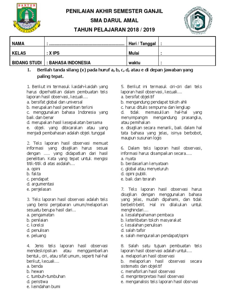 Soal Ulangan Harian Kelas X Bahasa Indonesia Semester 1 Laporan Hasil Teks Observasi Dan Teks Eksposisi