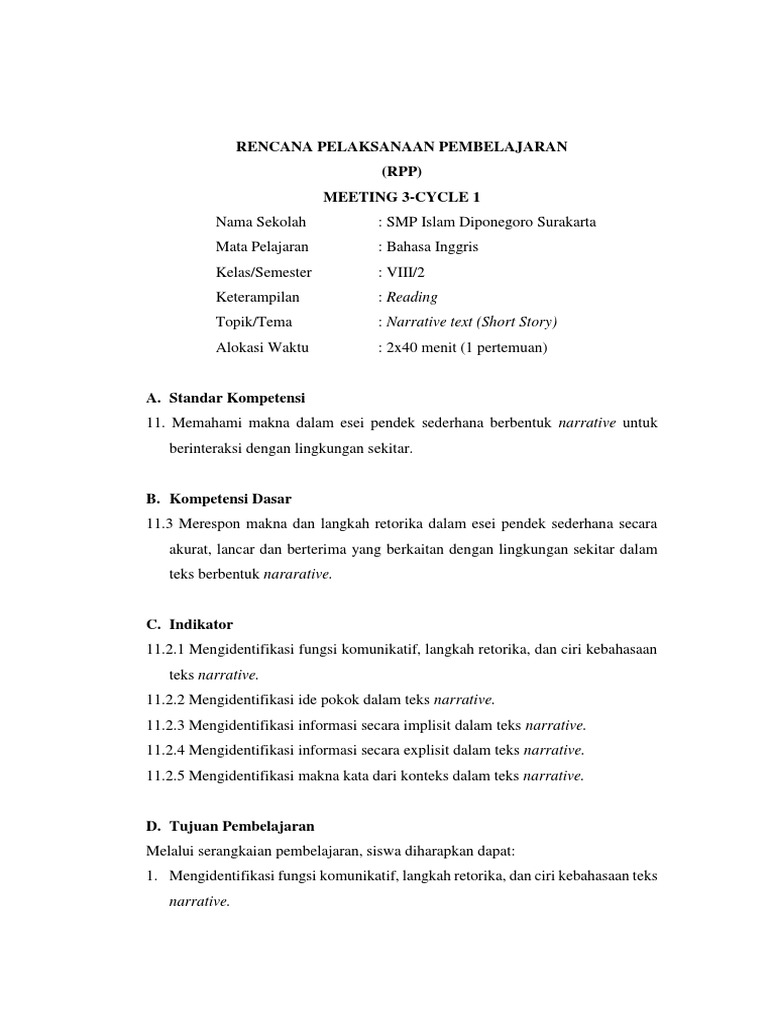 Rpp Bahasa Inggris SMK kelas X teks Narative