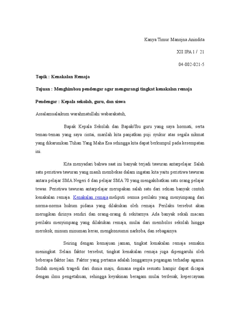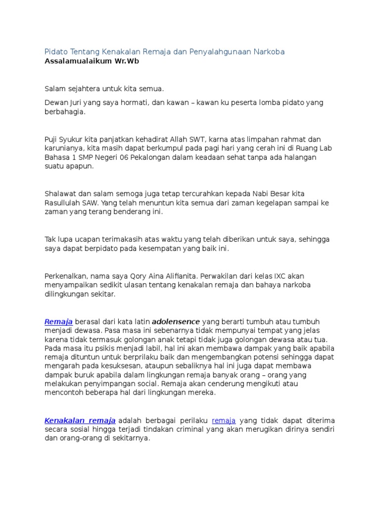 DOC) Contoh Pidato Singkat Tentang Kenakalan Remaja | Hadi Tomi - Academia.edu