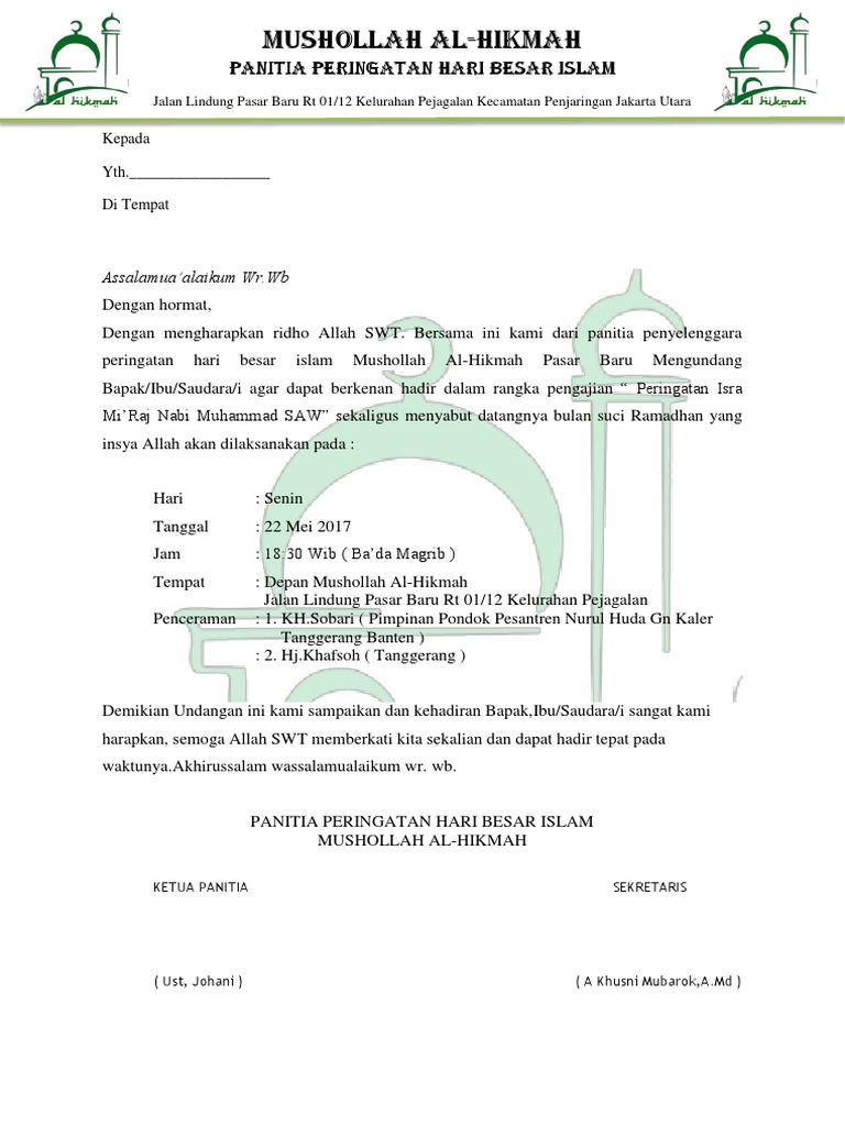 CONTOH SURAT UNDANGAN PERINGATAN ISRA DAN MI’RAJ NABI MUHAMMAD SAW - husnuls492.com