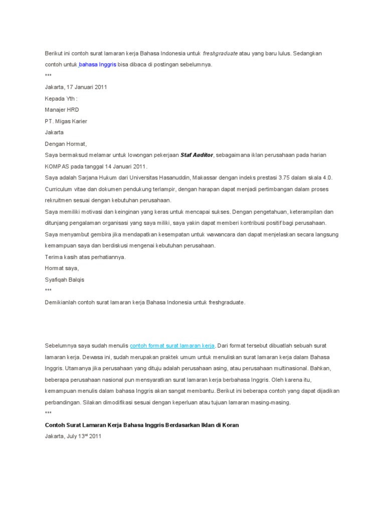 Download Contoh Surat Lamaran Kerja Fresh Graduate Indo Inggris