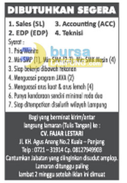 CV. Fajar Citra Lestari - Lowongan Kerja Bandar Lampung - Berita Viral Hari Ini, Lowongan Kerja Hari Ini