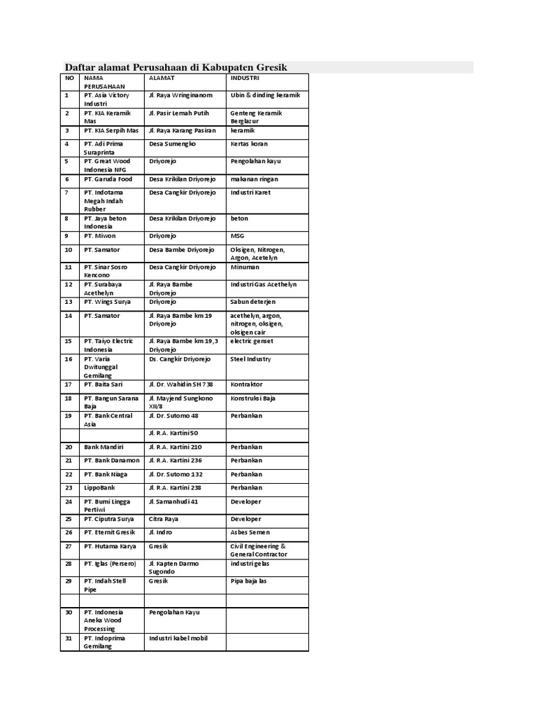 Daftar Alamat Perusahaan Di Kabupaten Gresik