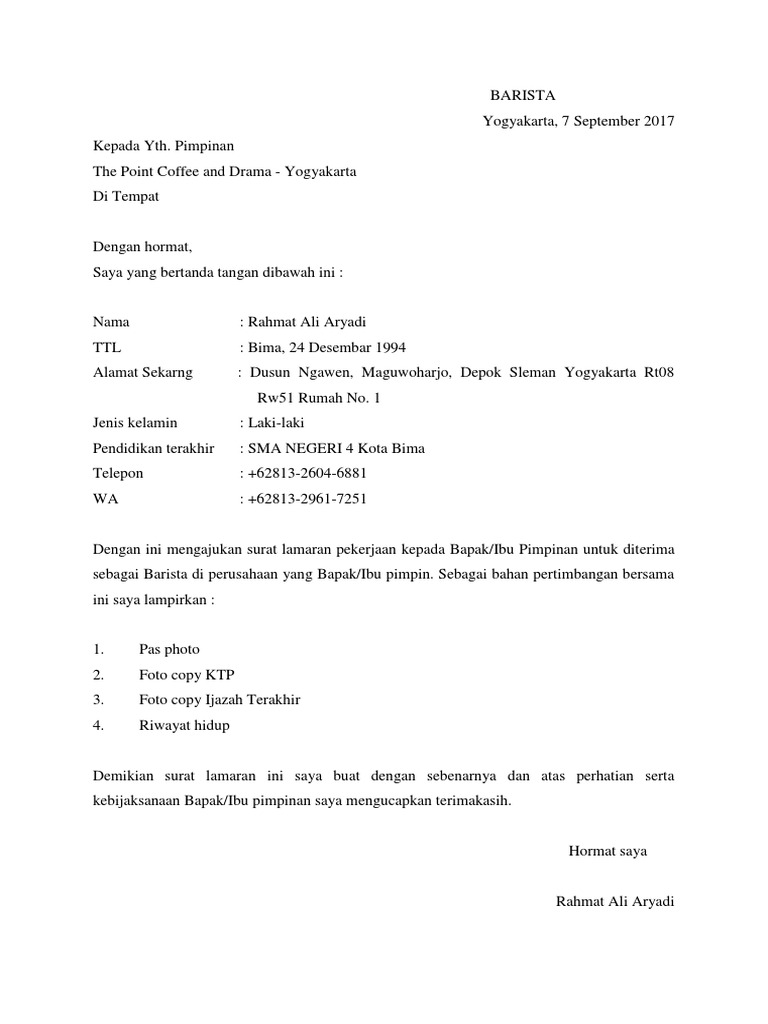 Contoh Surat Lamaran Kerja Barista Di Cafe - Kumpulan Surat Penting