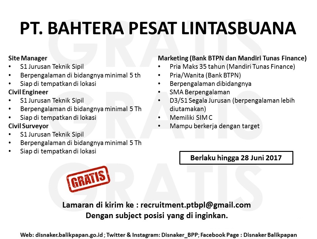 Lowongan Kerja Kota Balikpapan: Lowongan PT. BAHTERA PESAT LINTASBUANA