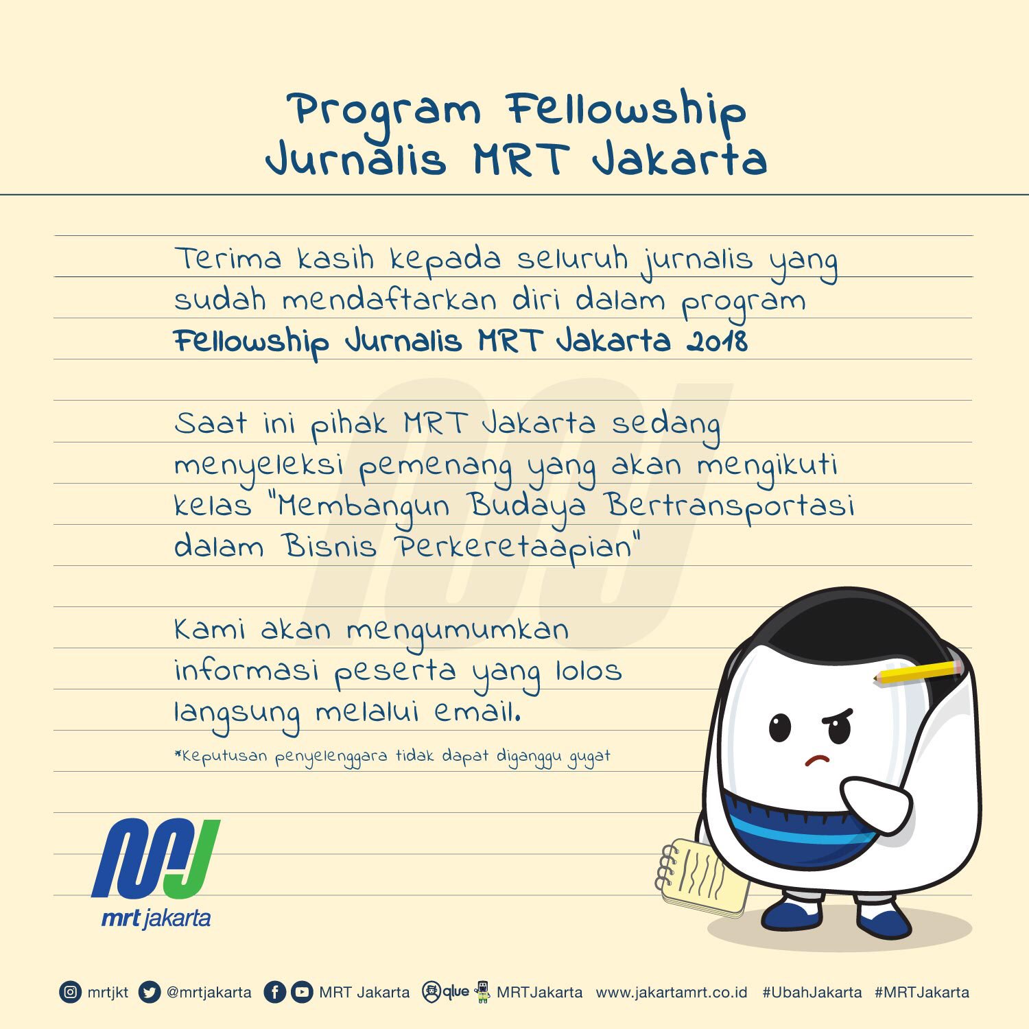 MRTJakarta a Twitter: “Terima kasih kepada seluruh jurnalis yang telah mendaftarkan diri dalam program Fellowship Jurnalis MRT Jakarta. Saat ini MRT Jakarta sedang menyeleksi pemenang yang akan terpilih. Pemenang akan dihubungi langsung