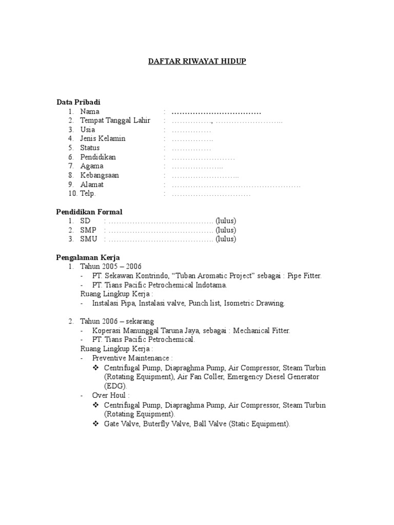 Contoh Formulir Daftar Riwayat Hidup Kosong Pdf - Temukan Contoh