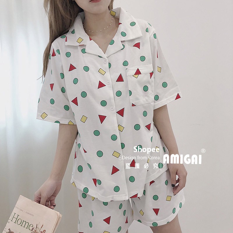 Set Baju Piyama Wanita Model Two-Pieces Lengan Pendek dengan Bahan Katun dan Gambar Kartun Chan | Shopee Indonesia