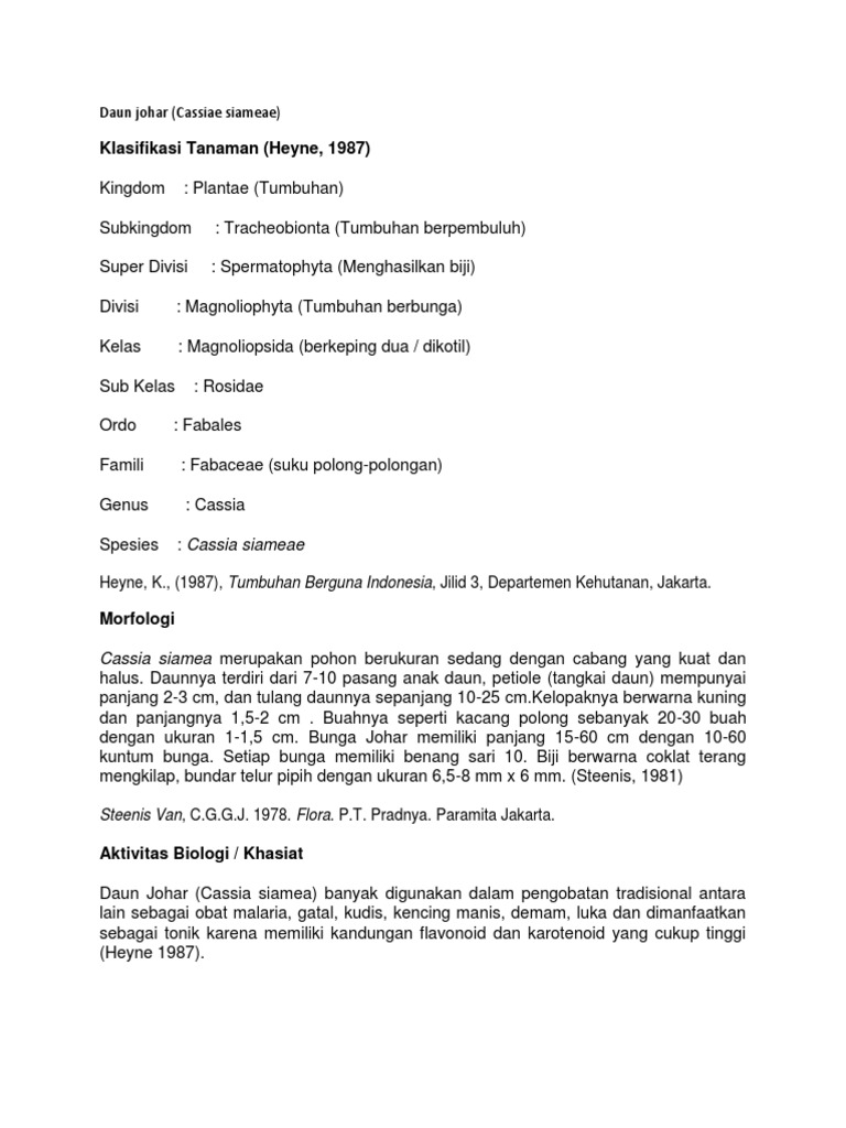 Johar (Cassia siamea L.) - dulcejulia91 .dipakai sebagai obat malaria. Daun- daun dan bagian tumbuhan - [PDF Document]