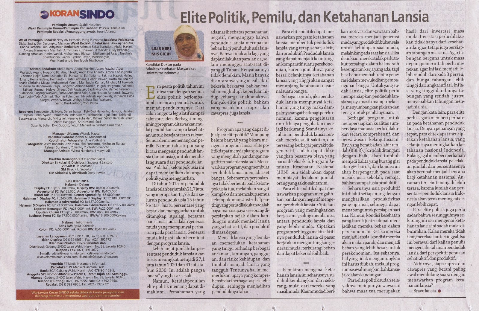 ELDERLY RESILIENCE : Artikel di Koran SINDO Tanggal 29 April 2014, Tentang Ketahanan Lansia