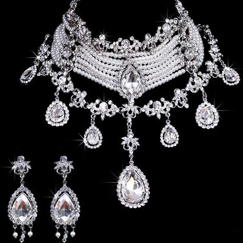MHS. MATAHARI 1 SET Fashion Mewah Kristal Pernikahan Set Perhiasan Berlian Imitasi Pearl Bridal Kalung & Anting Anting Set Wanita Pernikahan partai Perhiasan|pearl bridal necklace|bridal necklacewedding party jewelry - AliExpress
