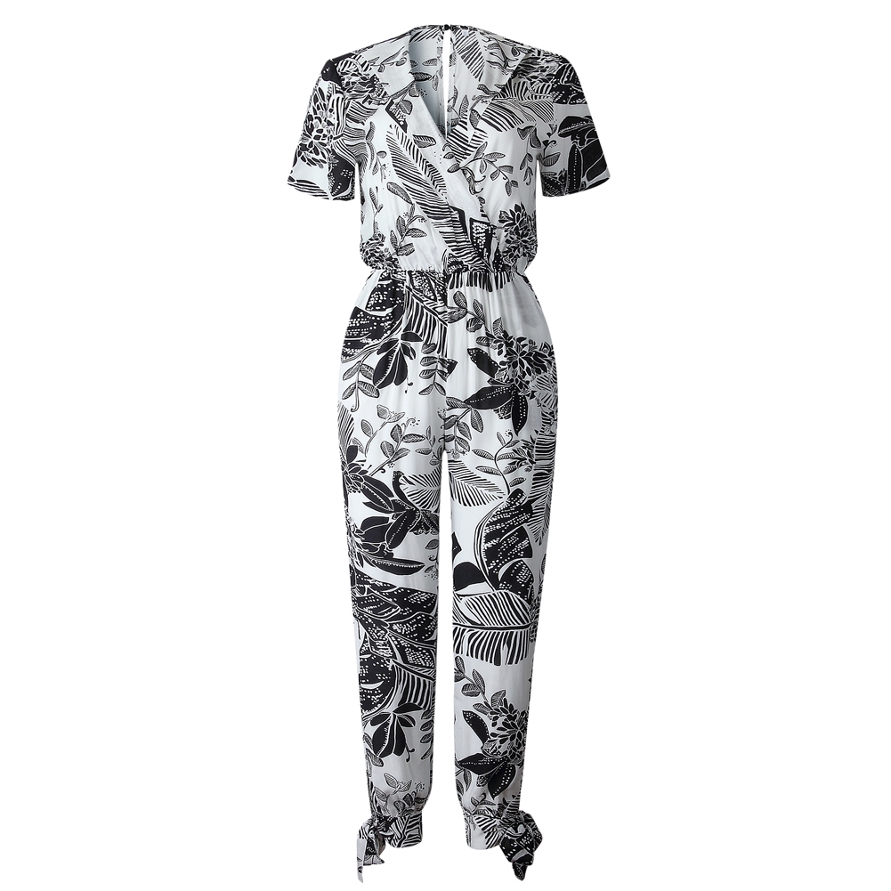 Jumpsuit Casual Wanita Lengan Pendek Dengan Kerah V-neck Dan Gambar Motif Daun | Shopee Indonesia