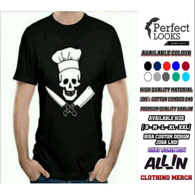 KAOS DISTRO CHEF TENGKORAK CHEF DESAIN GAMBAR TENGKORAK DAN PISAU SABLON POLYFLEX PU KOREA | Shopee Indonesia