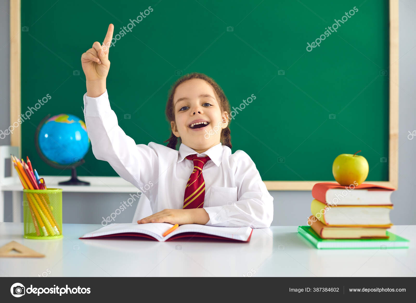 Kembali ke sekolah. Konsep ide di sekolah. Gadis sekolah yang ceria mengangkat jarinya saat duduk melawan dewan sekolah hijau di kelas. — Stok Foto © lacheev #387384602