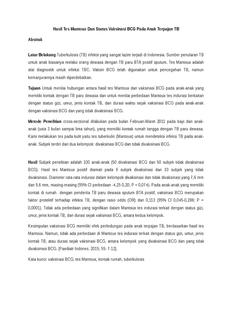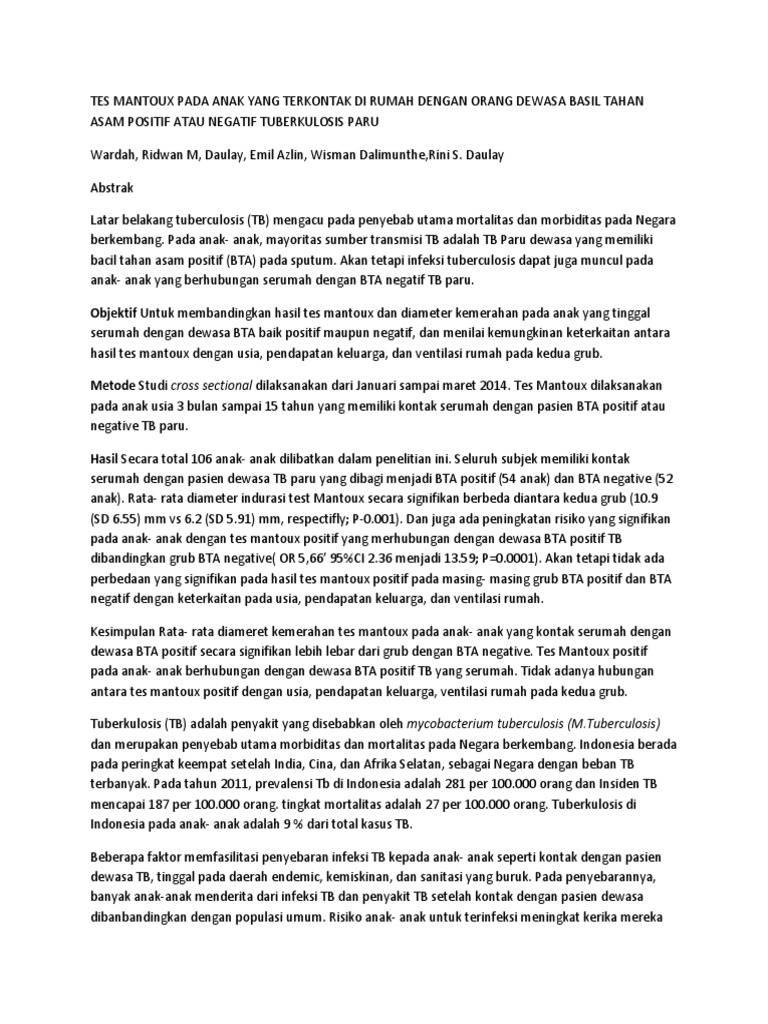 Tes Mantoux Pada Anak Yang Terkontak Di Rumah Dengan Orang Dewasa Basil Tahan Asam Positif Atau Negatif Tuberkulosis Paru