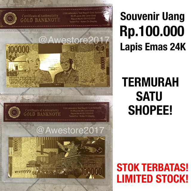 Uang Replika 100.000 Rupiah Lapis Emas 24K Seratus Ribu Gold Plated | Shopee Indonesia