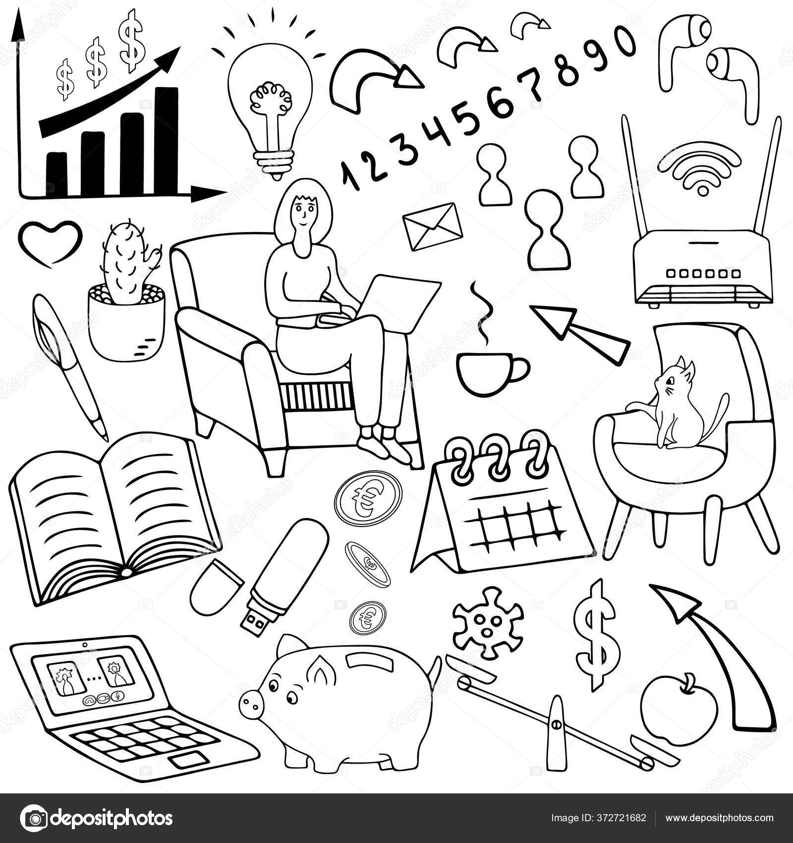 Pekerjaan Dan Pendidikan Rumah Set Elemen Vektor Kontur Pada Latar — Stok Vektor © GebbiMur #372721682