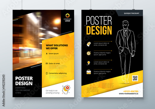 Poster design. A3, A2, A1. Black Yellow Corporate business template for poster, banner, placard, billboard, movie poster. Layout with modern elements and abstract triangle background. Creative concept - Buy this stock vector