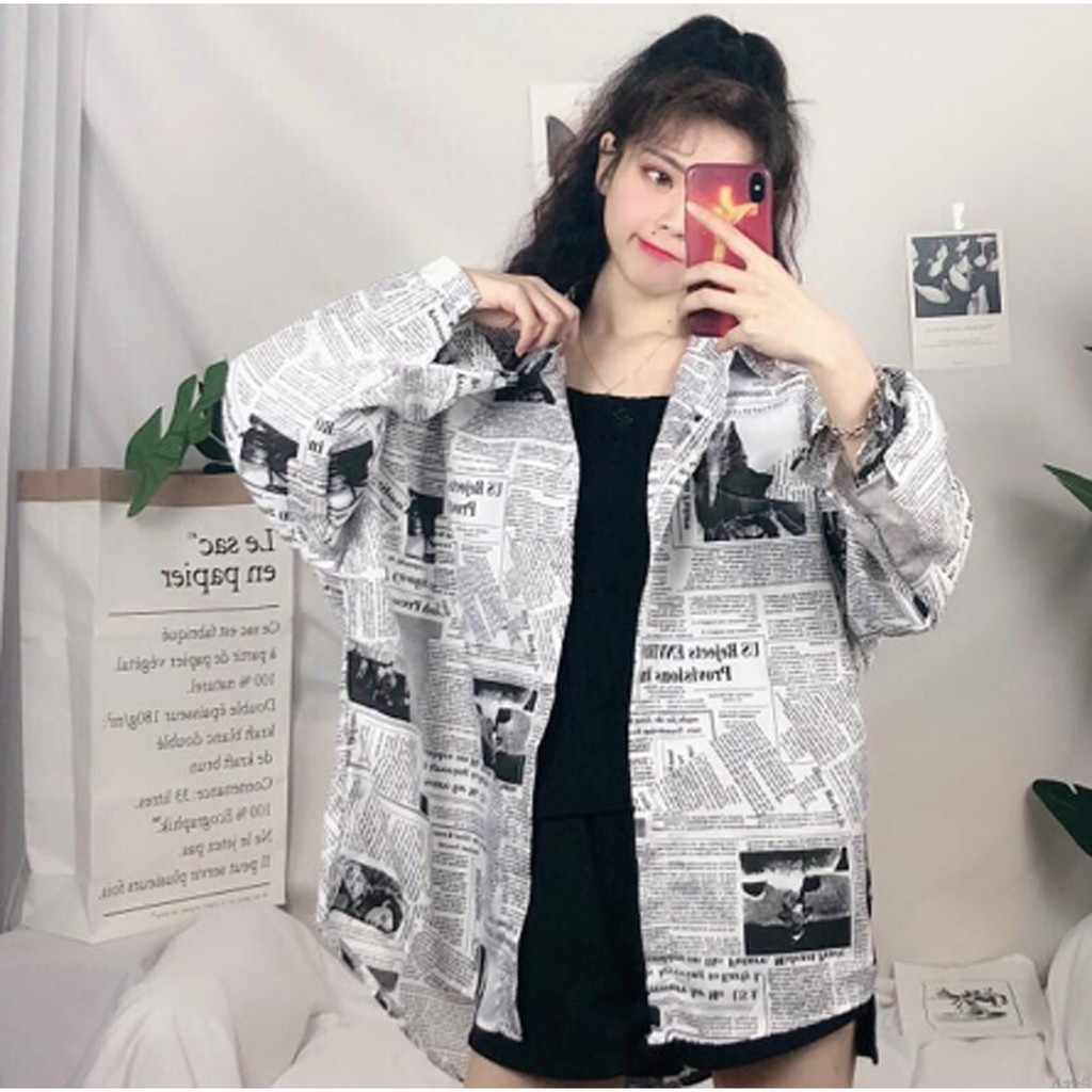 KEMEJA WANITA MOTIF KORAN // BAJU CEWEK MOTIF NEWSPAPER // BAJU WANITA | Shopee Indonesia