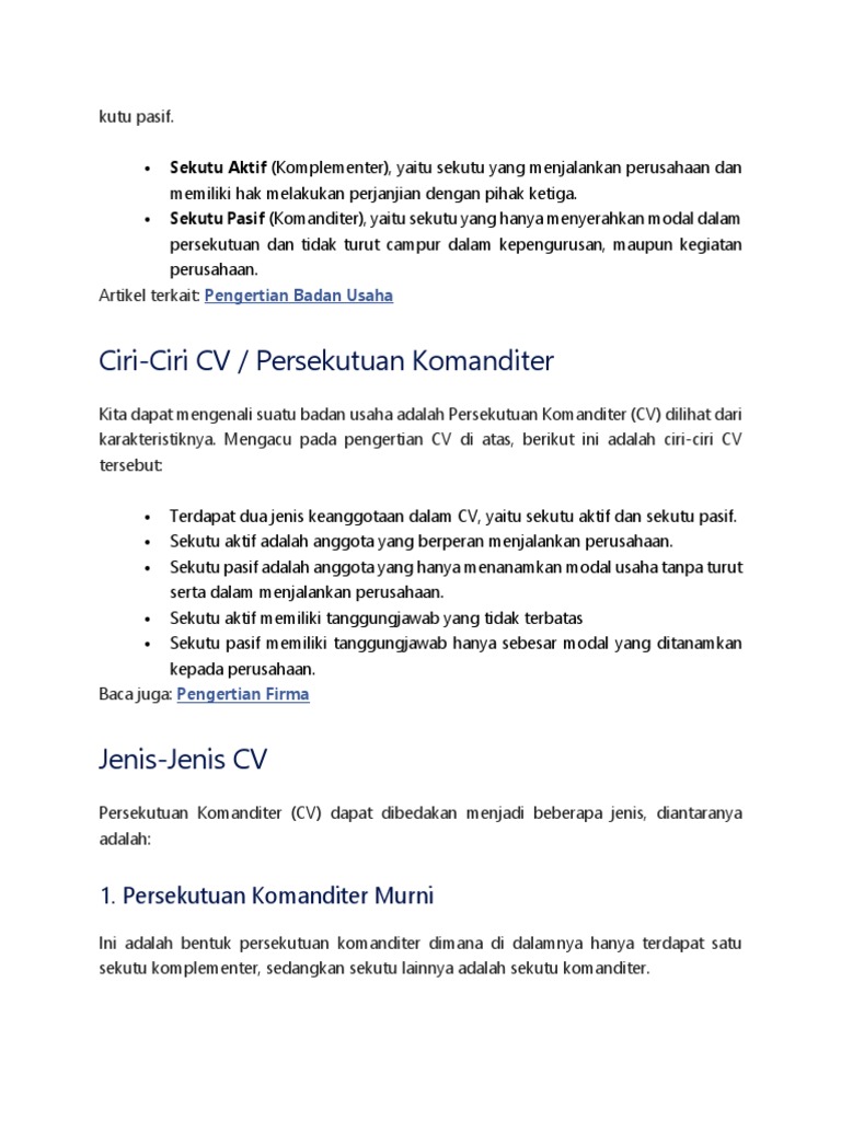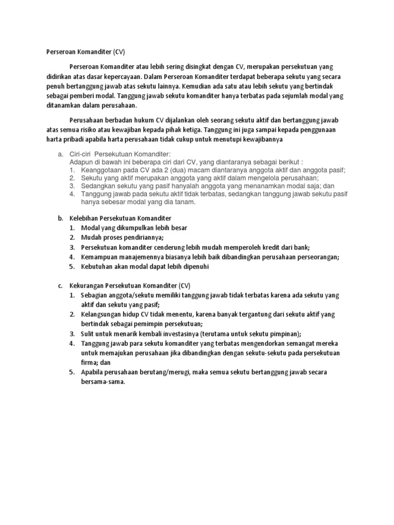 DOC) Perusahaan Komanditer / CV (Comanditaire Vennootschap) | Aria Ramawanda - Academia.edu
