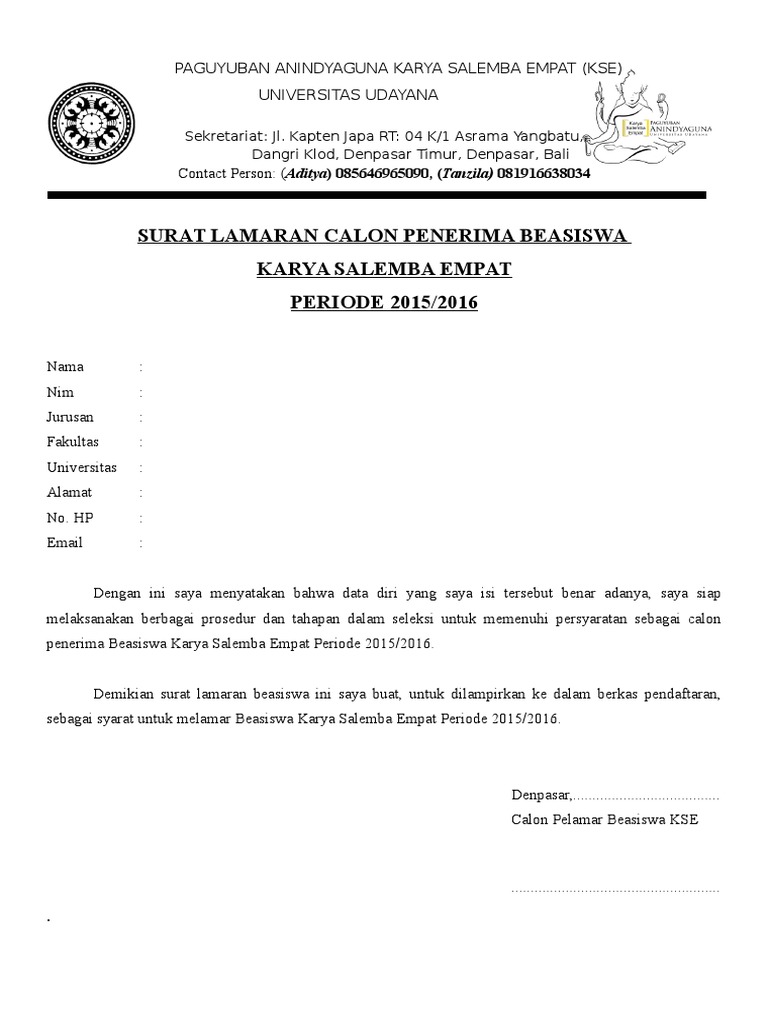 Formulir-dan-Contoh-Surat-Lamaran-Beasiswa-KSE - FORMULIR PERMOHONAN BEASISWA Kepada Yth Yayasan Karya Salemba Empat Jl Bank Raya II No 14 B Mampang | Course Hero