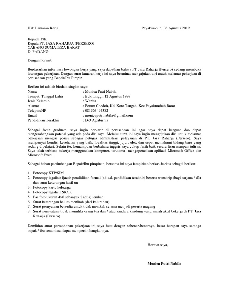 Surat Lamaran Kerja Pt Jasa Raharja - Contoh Surat Lamaran Kerja
