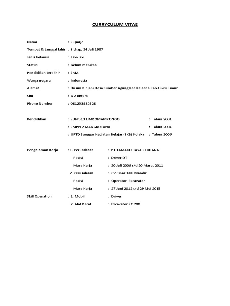 Contoh Cv Operator Alat Berat