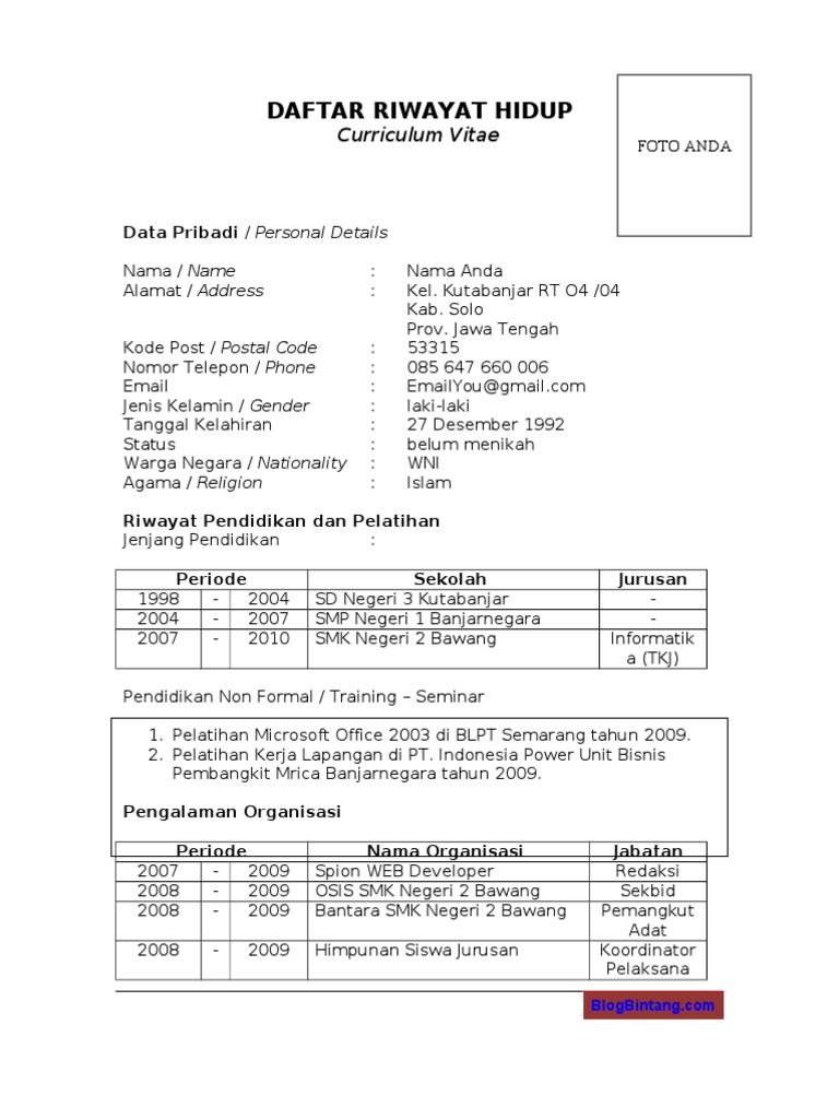 Contoh Cv Lamaran Kerja Untuk Fresh Graduate | Riwayat hidup, Pendidikan, Hidup