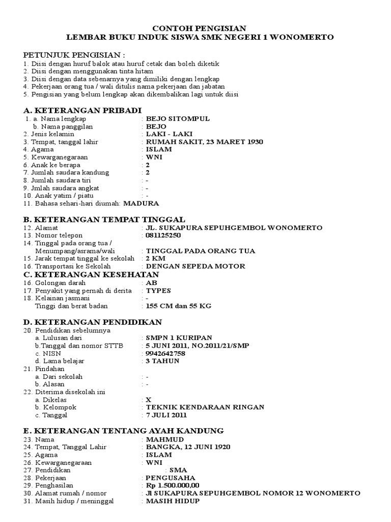 Contoh Lembar Buku Induk Siswa Smk Negeri 1 Wonomerto