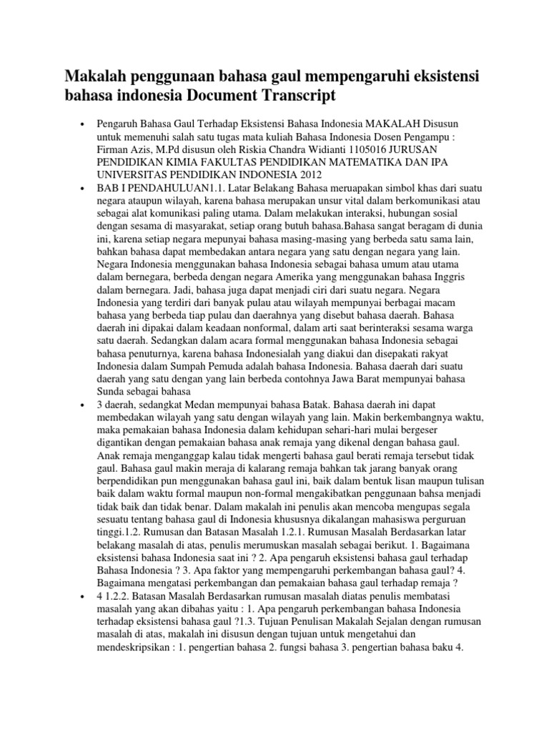 Makalah Penggunaan Bahasa Gaul Mempengaruhi Eksistensi Bahasa Indonesia Document Transcript
