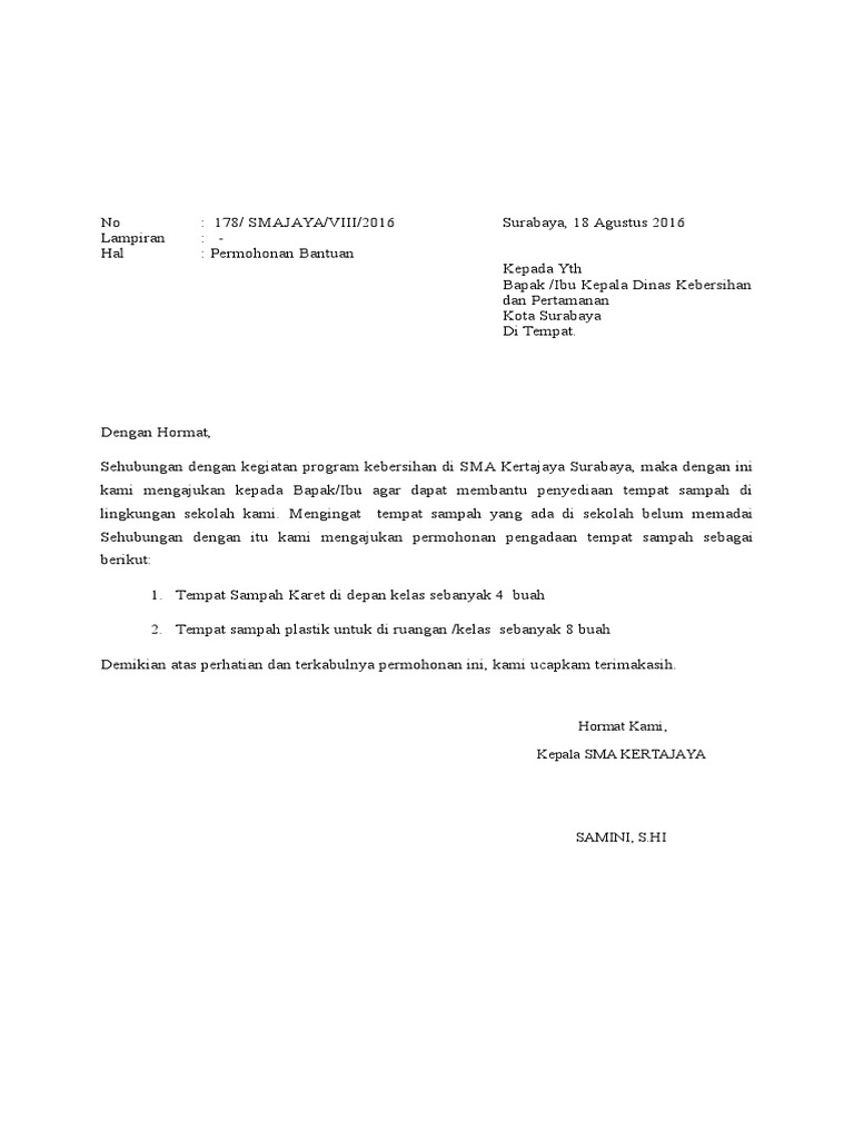 Contoh Surat Permohonan Bantuan Tempat Sampah - Contoh Seputar Surat