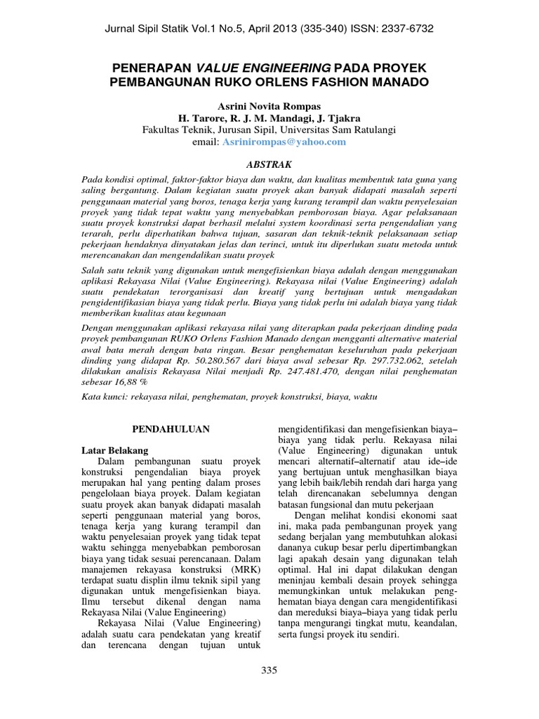Penerapan Value Engineering Pada Proyek Pembangunan Ruko Orlens Fashion Manado