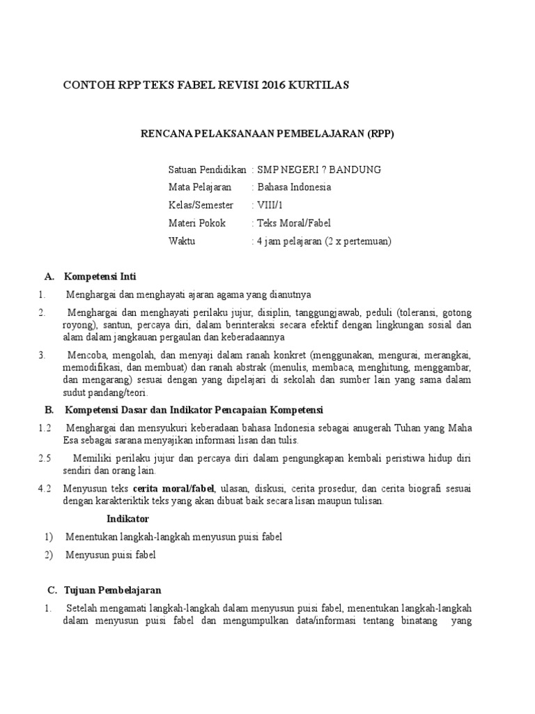 Contoh RPP K13 Bahasa Indonesia Teks Fabel Terbaru Disertai Literasi, PPK, 4C dan HOTS - Rumah Shaleh
