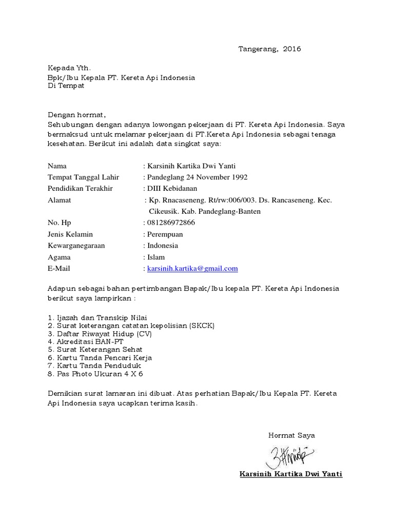 Contoh Membuat Surat Lamaran Kerja Pt Kai
