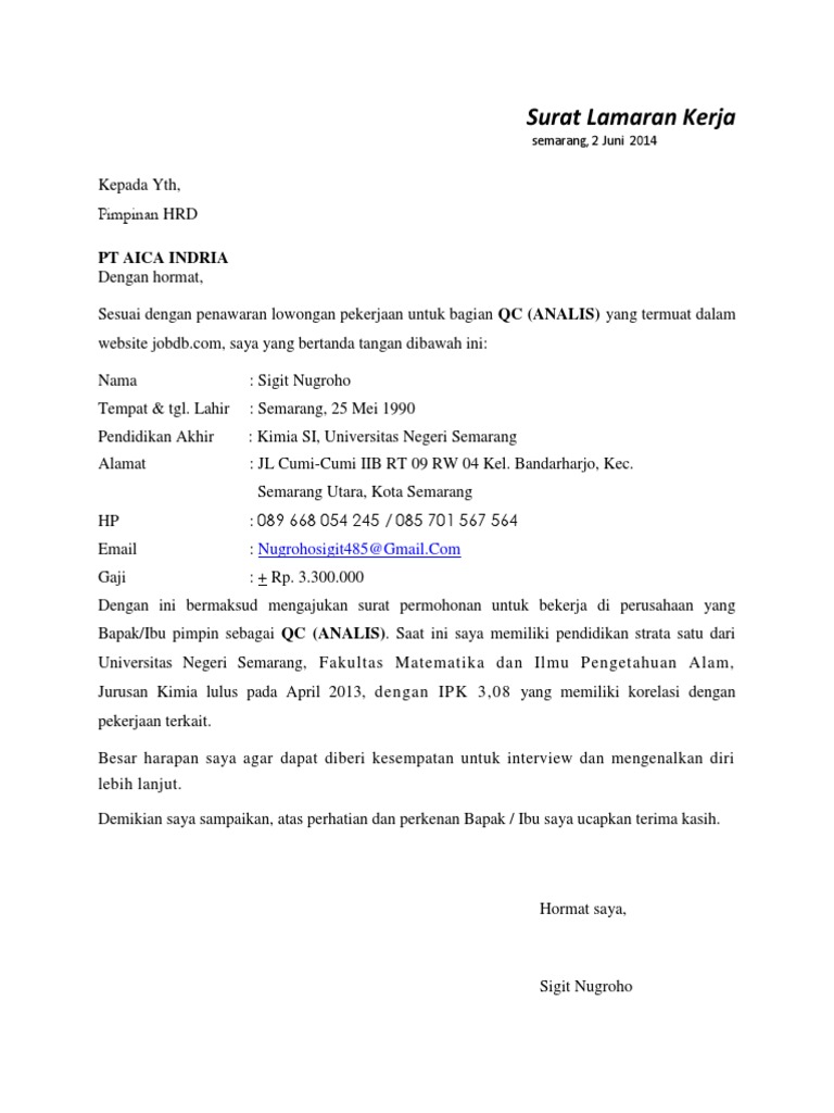 Contoh Surat Lamaran Kerja Analis Kimia - Contoh Emp
