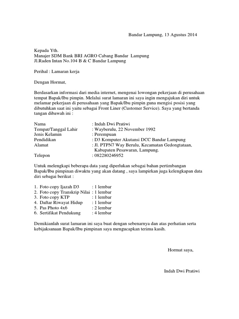 Contoh Surat Lamaran Kerja Di Bank Dalam Bahasa Indonesia