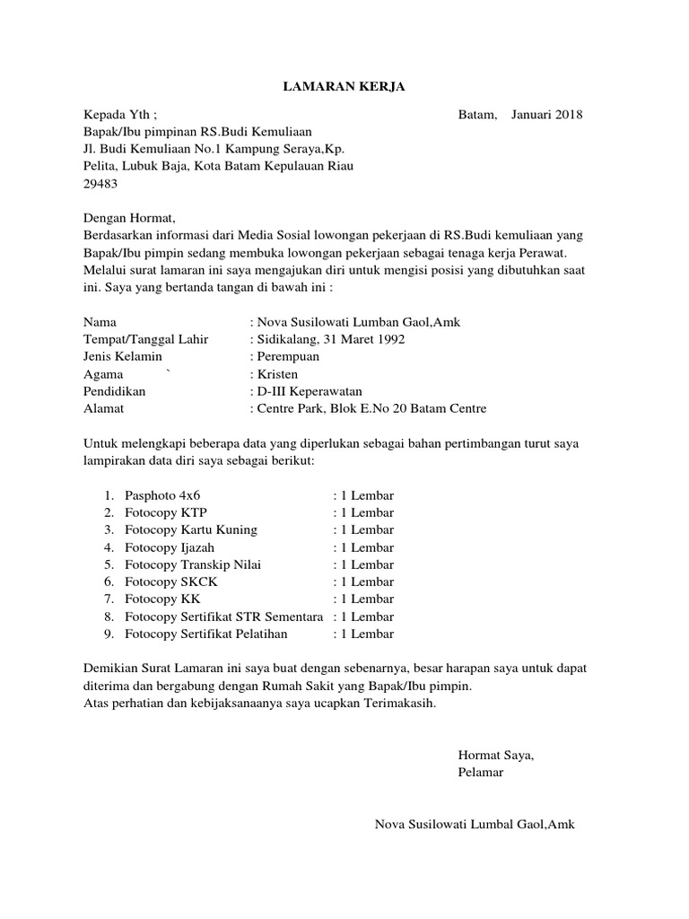 Contoh Surat Lamaran Kerja Di Rumah Sakit Awal Bros