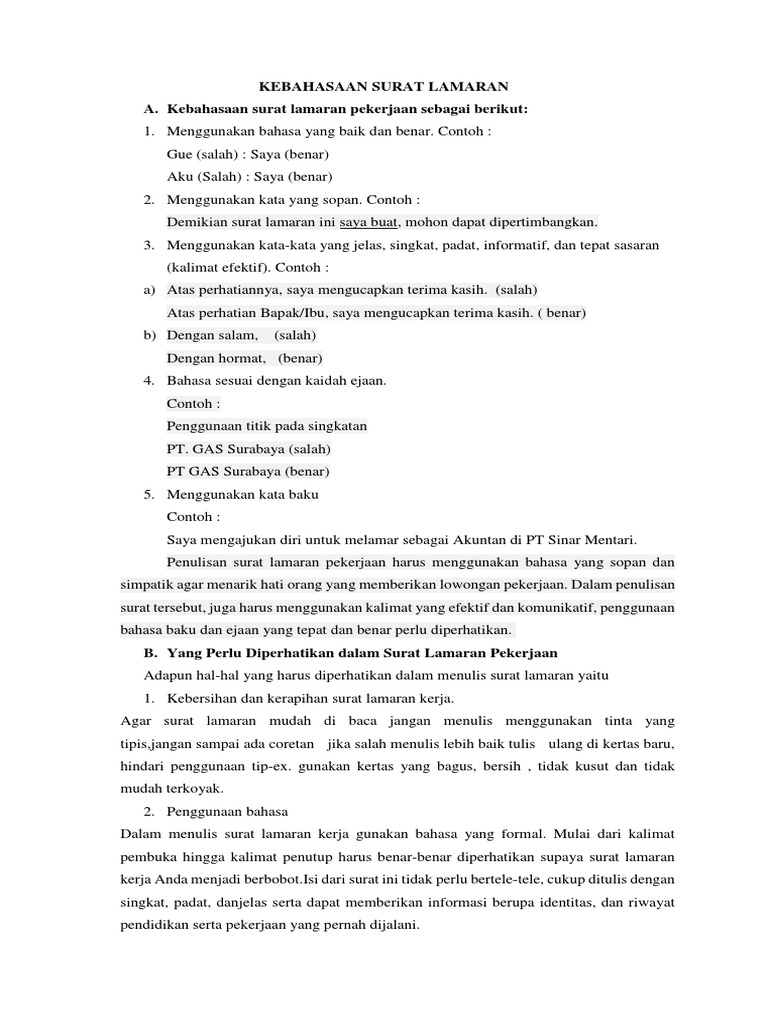 Kebahasaan Surat Lamaran A. Kebahasaan surat lamaran pekerjaan sebagai berikut