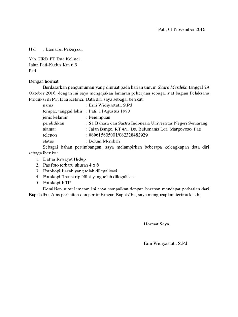 Contoh Surat Lamaran Kerja Di Pt Dua Kelinci Pati