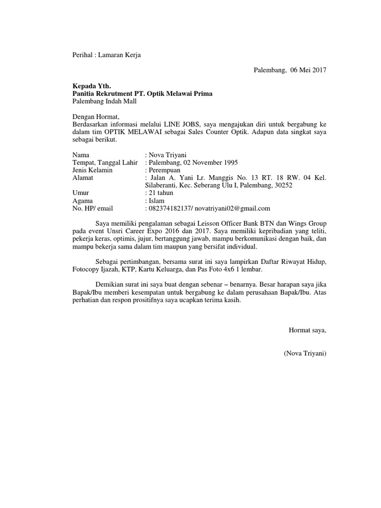 Contoh Surat Lamaran Kerja Di Optik Modern