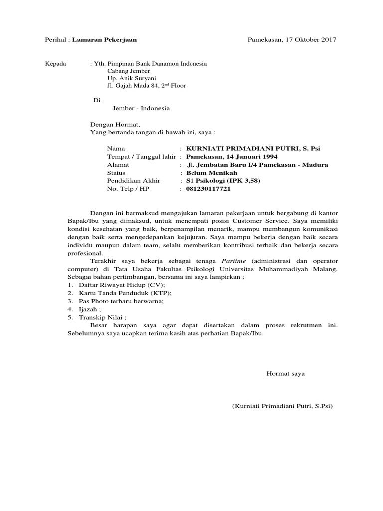 Contoh Surat Lamaran Kerja Untuk Di Bank Danamon – Backup Gambar