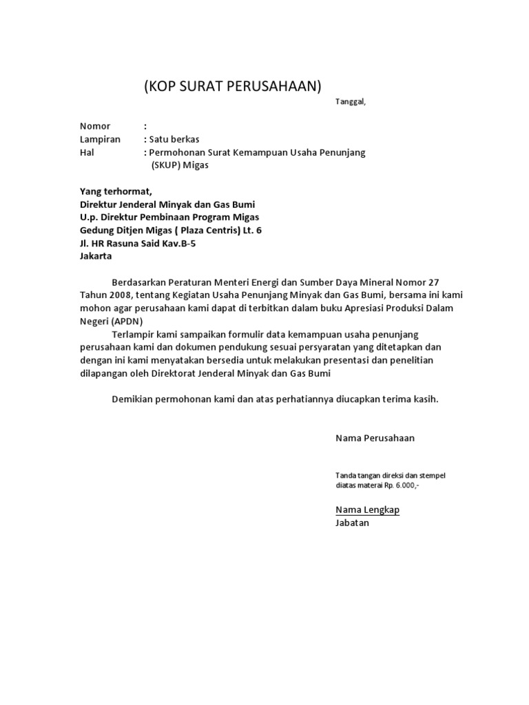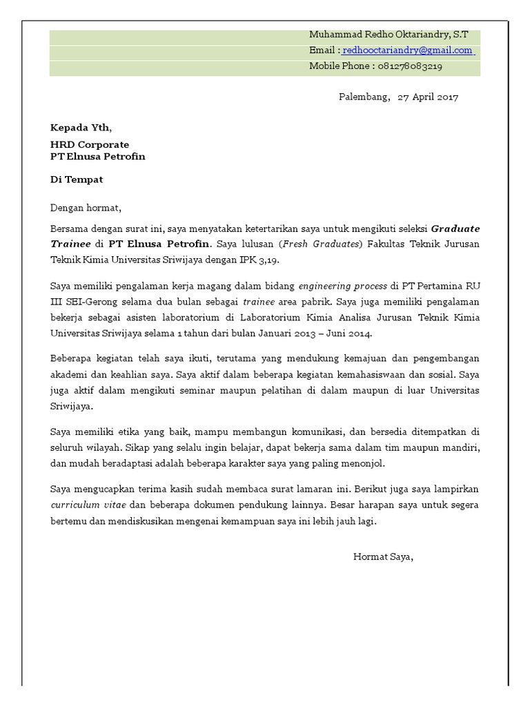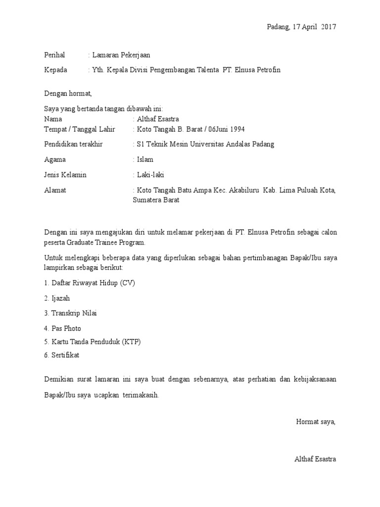 Contoh Surat Lamaran Kerja Di Elnusa Petrofin