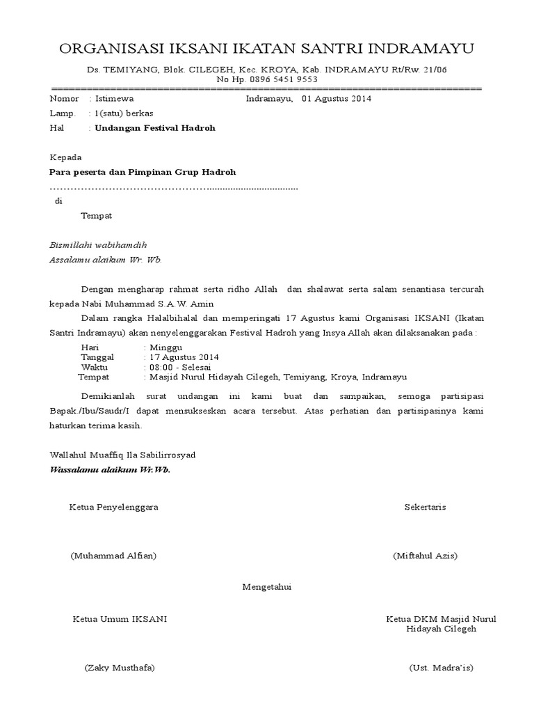 Contoh Format Surat Undangan Pengajian Akbar Haflah Akhirussanah Ponpes - Madrasah