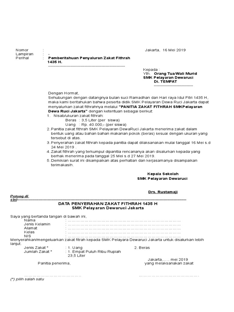 Contoh Surat Pemberitahuan Zakat Fitrah Sekolah