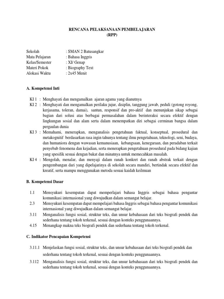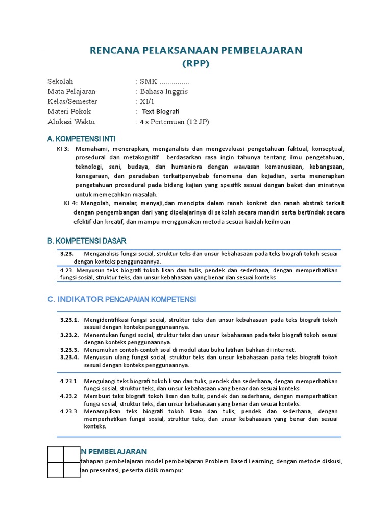 RPP Bahasa Inggris Kelas XI SMK tentang Teks Biografi -